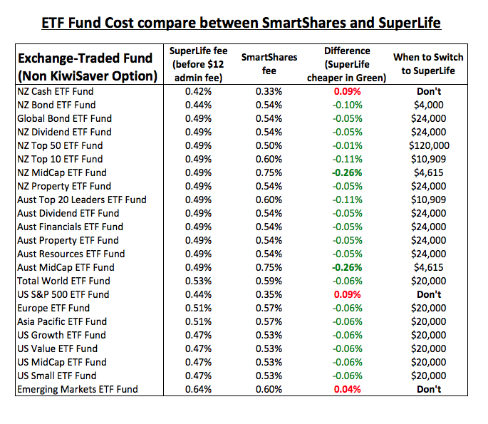 In general, SuperLife offers lower fund management fees. However, they do charge a $12/year admin fee which makes SuperLife more expensive when you are starting out. You should, therefore, start with SmartShares and once your hold reaches the “When to Switch” amount, you can move your fund to SuperLife to enjoy the lower cost and the better user interface.